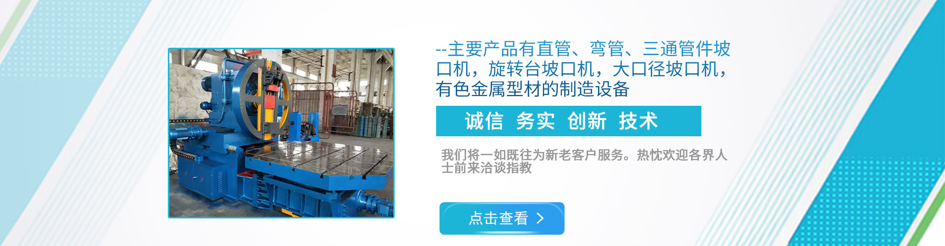 公司現(xiàn)下轄兩個(gè)分廠,一分廠主營(yíng)電動(dòng)管道坡口機(jī)和焊接設(shè)備,適用于造船、電力工程安裝、石油、化工、鍋爐廠、冶金以及鋼鐵行業(yè); 二分廠主營(yíng)雙頭坡口機(jī),600mm直管坡口機(jī)和金屬型材擠壓生產(chǎn)線,適用于銅、鋁、鎂、鉛、鋅等有色金屬及其合金的加工。